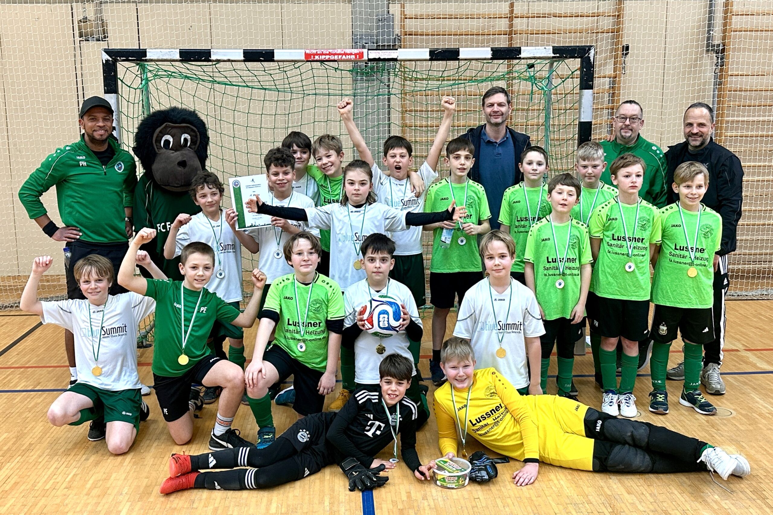 Die U11-2 des FCF schaffte es als Tabellenzweiter ins „obere“ Halbfinale und blieb hier im entscheidenden 7-Meter-Schießen gegen den FC Phönix Schleißheim mit 2:1 Toren siegreich, wobei man schon wie der Verlierer aussah, es dann aber dem gut reagierenden FCF-Torhüter zu verdanken hatte, dass nach dem 0:1 Rückstand das Tor wie vernagelt blieb. Im Finale ging es dann gegen den SV Riedmoos und wieder landete man im 7-Meter-Schießen. Diesmal brauchte es jeweils 5 Schützen, um den Sieger des Hallenturniers zu ermitteln. Wieder ein Rückstand und wieder ließ der FCF-Torhüter keinen zweiten Treffer zu, so dass man nach 10 geschossenen 7-Metern am Ende mit 2:1 als Sieger das Spielfeld verlassen konnte.