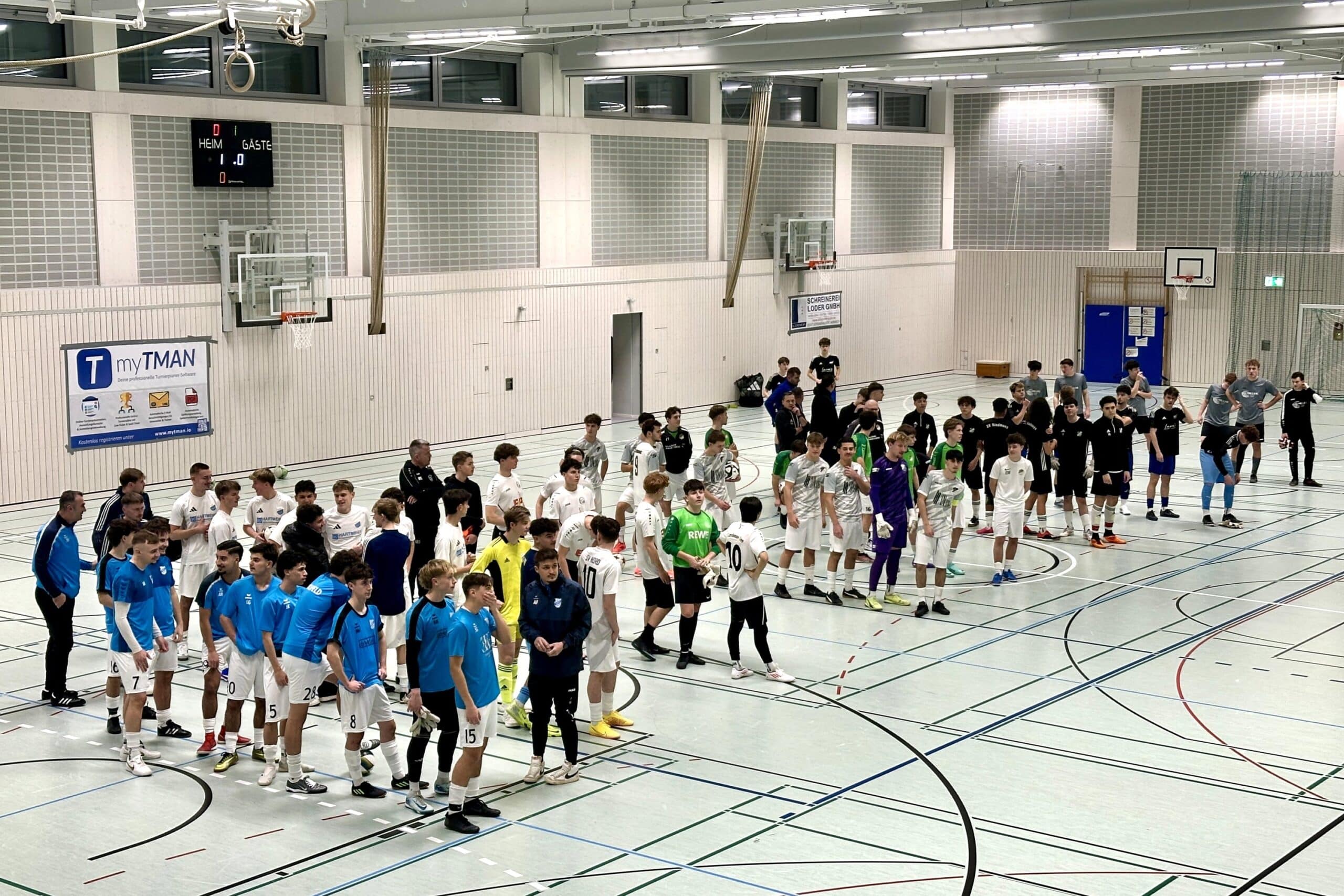 Mitten in die Drangphase der Lerchenauer dann die 2:0 Führung, der aber schnell der 2:1 Anschlusstreffer folgte. Danach wurde es etwas chaotisch. Der Torhüter ist dabei, den Ball aus dem Netz zu holen, da stürzen sich zwei Lerchenauer auf ihn und wollen ihm den Ball wegnehmen. Es kam zu einem Tumult und Schubsereien, an denen jedoch der Torhüter nicht beteiligt war. Trotzdem entschieden die Schiedsrichter auf eine 2-Minuten Strafe gegen ihn und die SG Nord-Fasanerie musste die letzten beiden Spielminuten mit einem Spieler im Tor zu Ende bringen. Trotz dieses Handicaps überstand die Mannschaft diese heikle Situation und schaffte es, mit einem 2:1 Sieg ins Finale der Dachauer Hallenmeisterschaft einziehen. Dieses findet am 31.01.2026 um 18.00 Uhr in Odelzhausen statt.